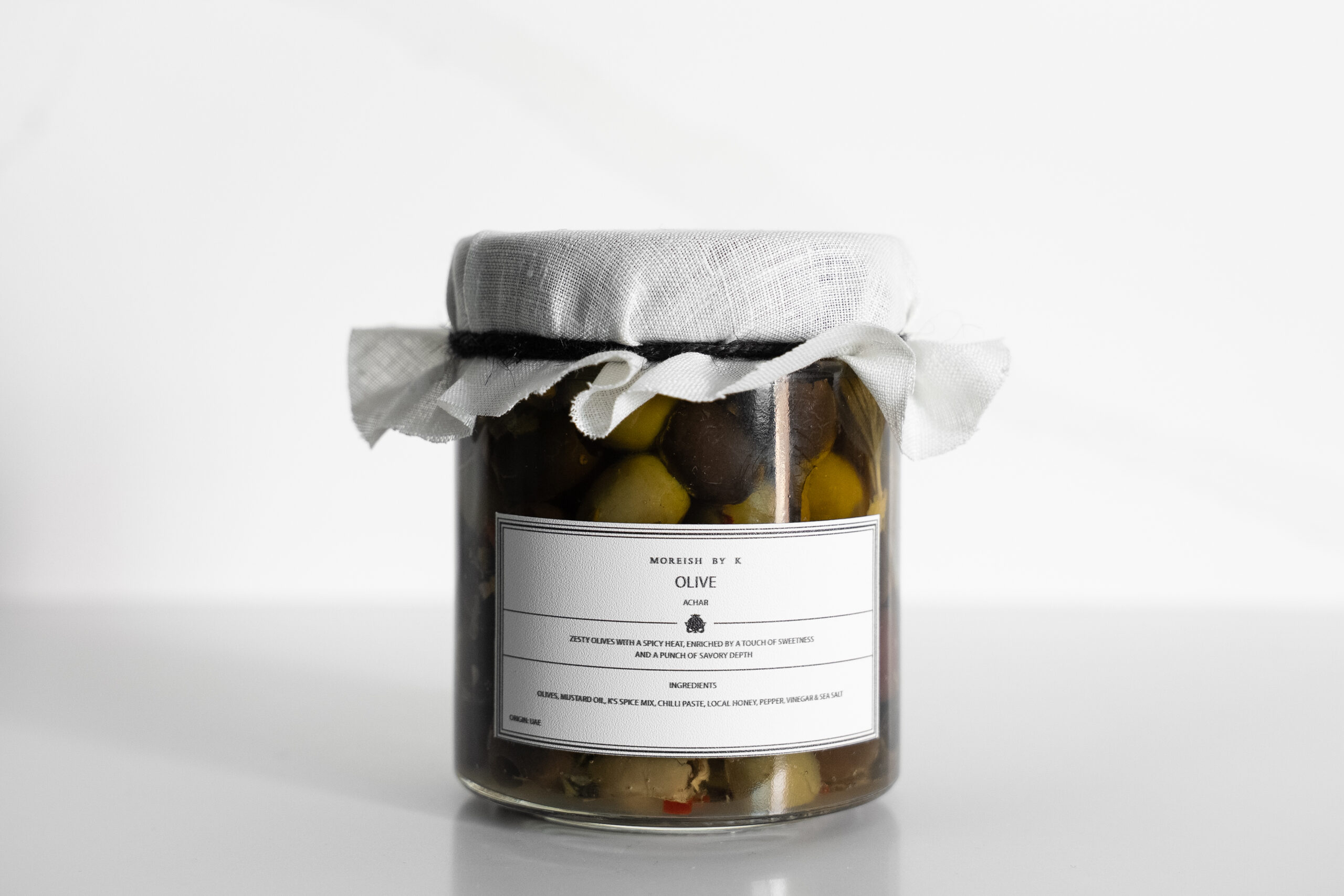 ZESTY OLIVES WITH A SPICY HEAT, ENRICHED BY A TOUCH OF SWEETNESS AND A PUNCH OF SAVORY DEPTH INGREDIENTS OLIVES, MUSTARD OIL, KS SPICE MIX, CHILLI PASTE, LOCAL HONEY, PEPPER, VINEGAR & SEA SALT