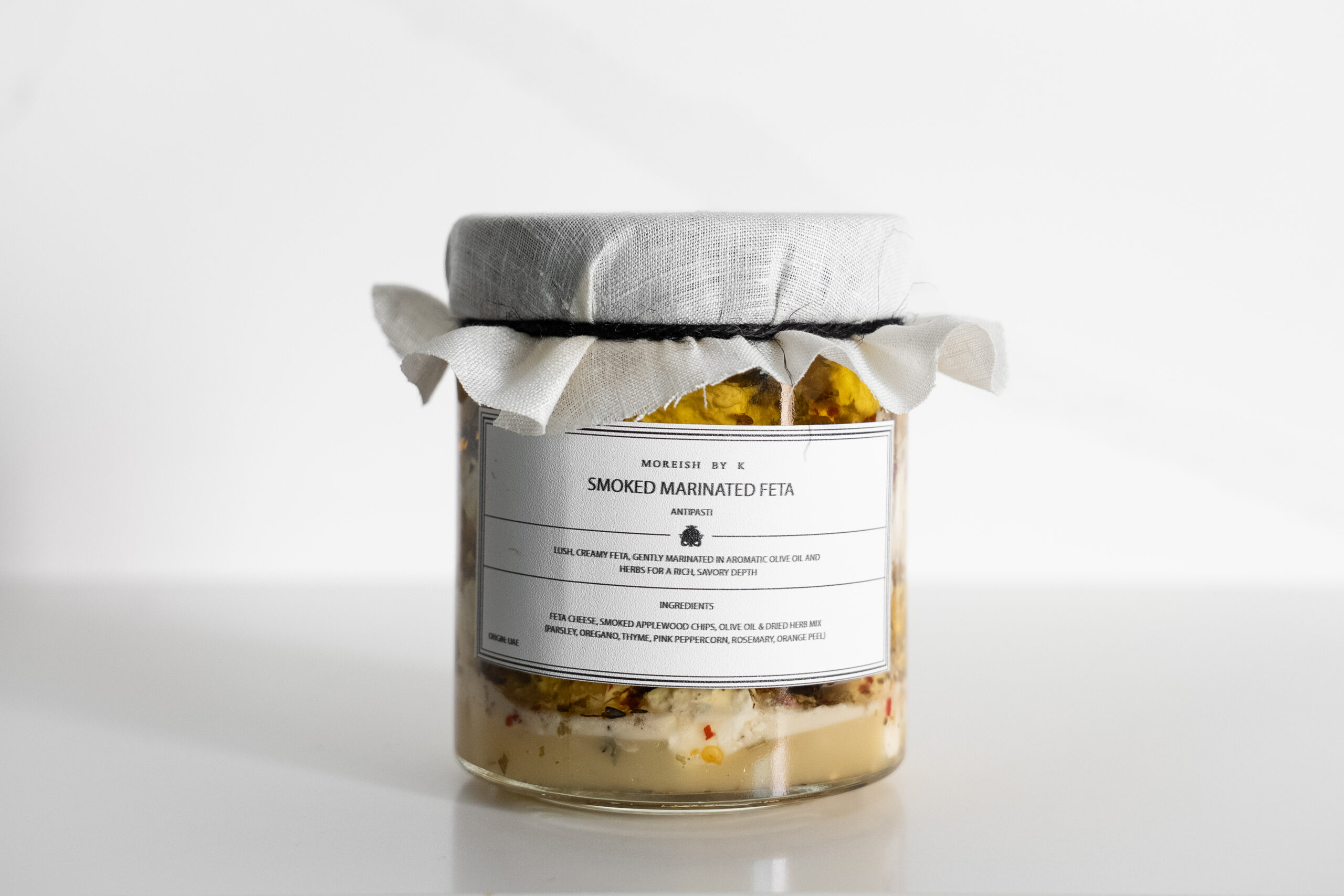LUSH CREAMY FETA, GENTLY MARINATED IN AROMATIC OLIVE OIL AND HERBS FOR A RICH, SAVORY DEPTH INGREDIENTS FETA CHEESE, SMOKED APPLEWOOD CHIPS, OLIVE OIL & DRIED HERB MIX (PARSLEY, OREGANO, THYME, PINK PEPPERCORN, ROSEMARY, ORANGE PEEL)