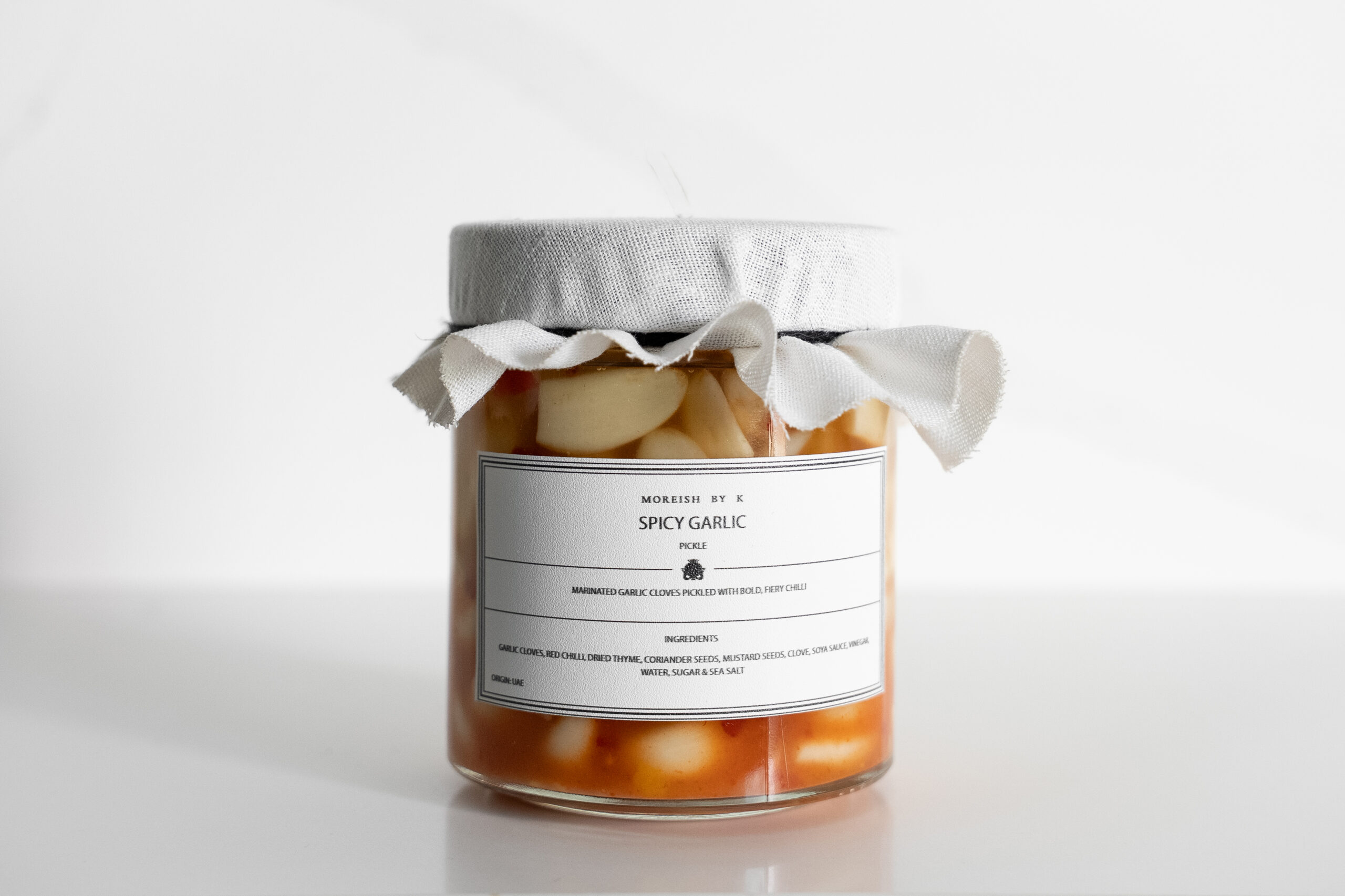 MARINATED GARLIC CLOVES PICKLED WITH BOLD, FIERY CHILLI INGREDIENTS GARLIC CLOVES, RED CHILLI, DRIED THYME, CORIANDER SEEDS, MUSTARD SEEDS, CLOVE, SOYA SAUCE, VINEGAR WATER, SUGAR & SEA SALT